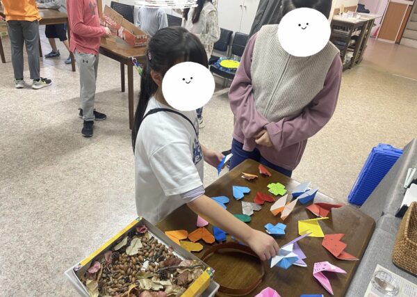 1~2年生の生活科の授業で「秋のおもちゃランド」を開催しました。生徒たちはこの日のために、10月に秋の木の実や綺麗な落ち葉を拾いに出かけました。様々な形のドングリや葉っぱ、とちの実やまつぼっくりなどを見つけて「秋探し」を楽しみました。